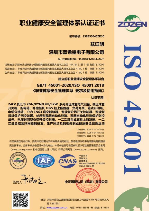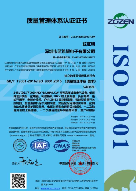 深圳市蓝希望电子有限公司(简称蓝希望)是一家专业从事研发、生产、销售高低压电力自动化成套设备的国家高新技术企业。公司成立于1998年,注册资金37000万元,总部位于深圳市光明区,下设1个子公司(南京蓝园精瑞电气有限公司)及1家分支机构(深圳市蓝希望电子有限公司电气设备制造厂)。公司主要生产智能环保型环网柜、电缆分支箱、柱上开关、高低压开关柜、配电自动化终端等产品,广泛应用于智能电网、电厂、交通、工矿企业、新能源等领域....更多>>
